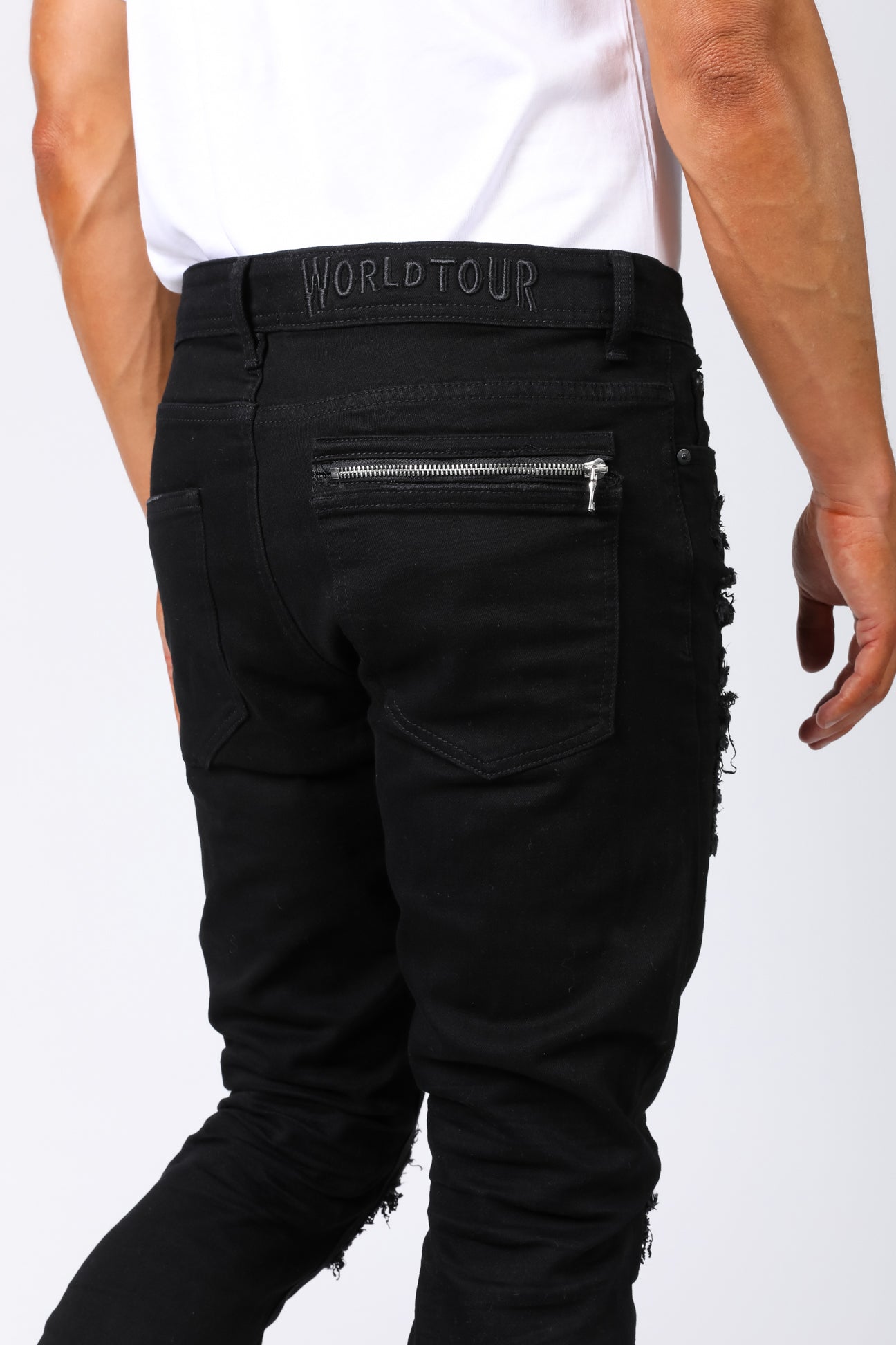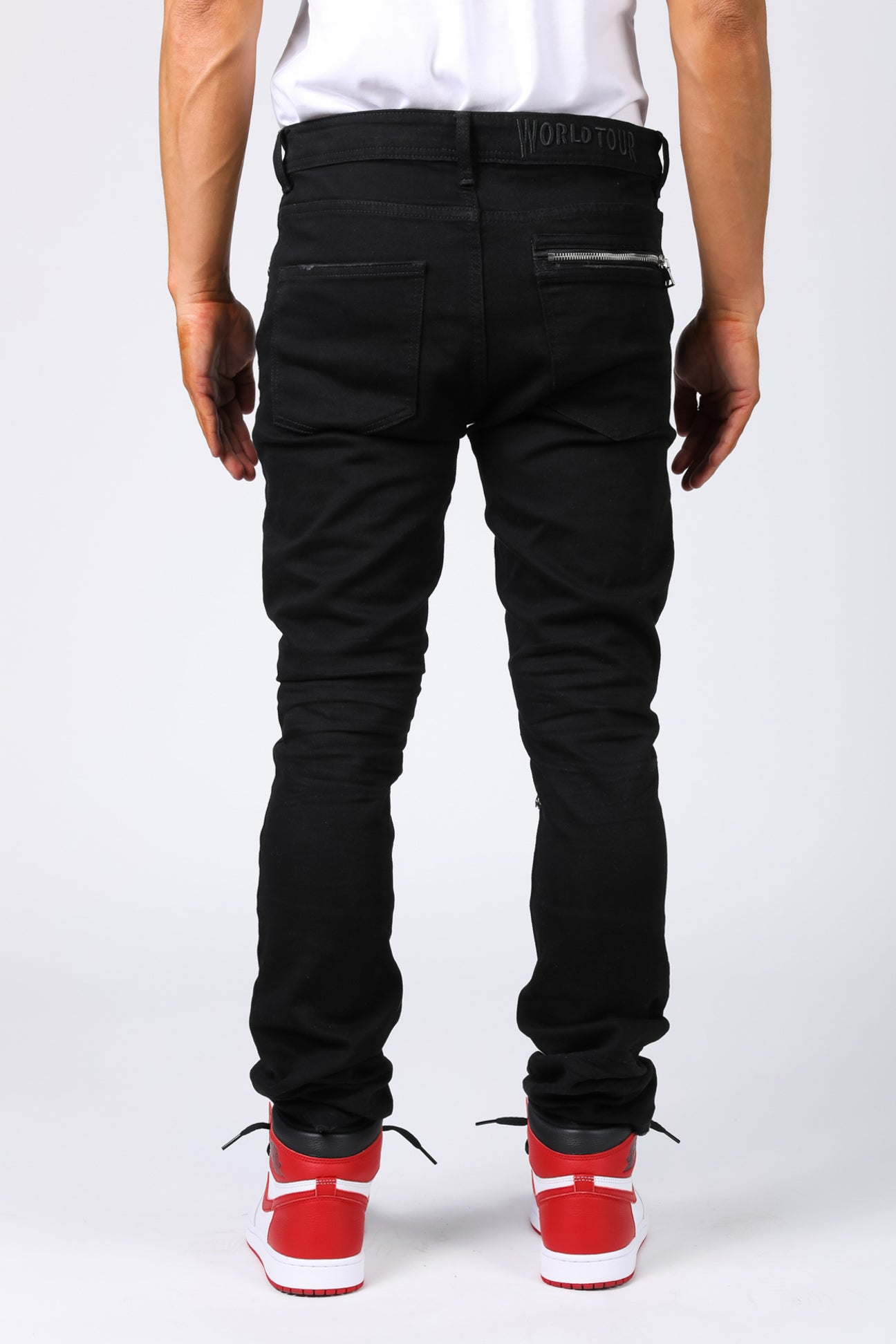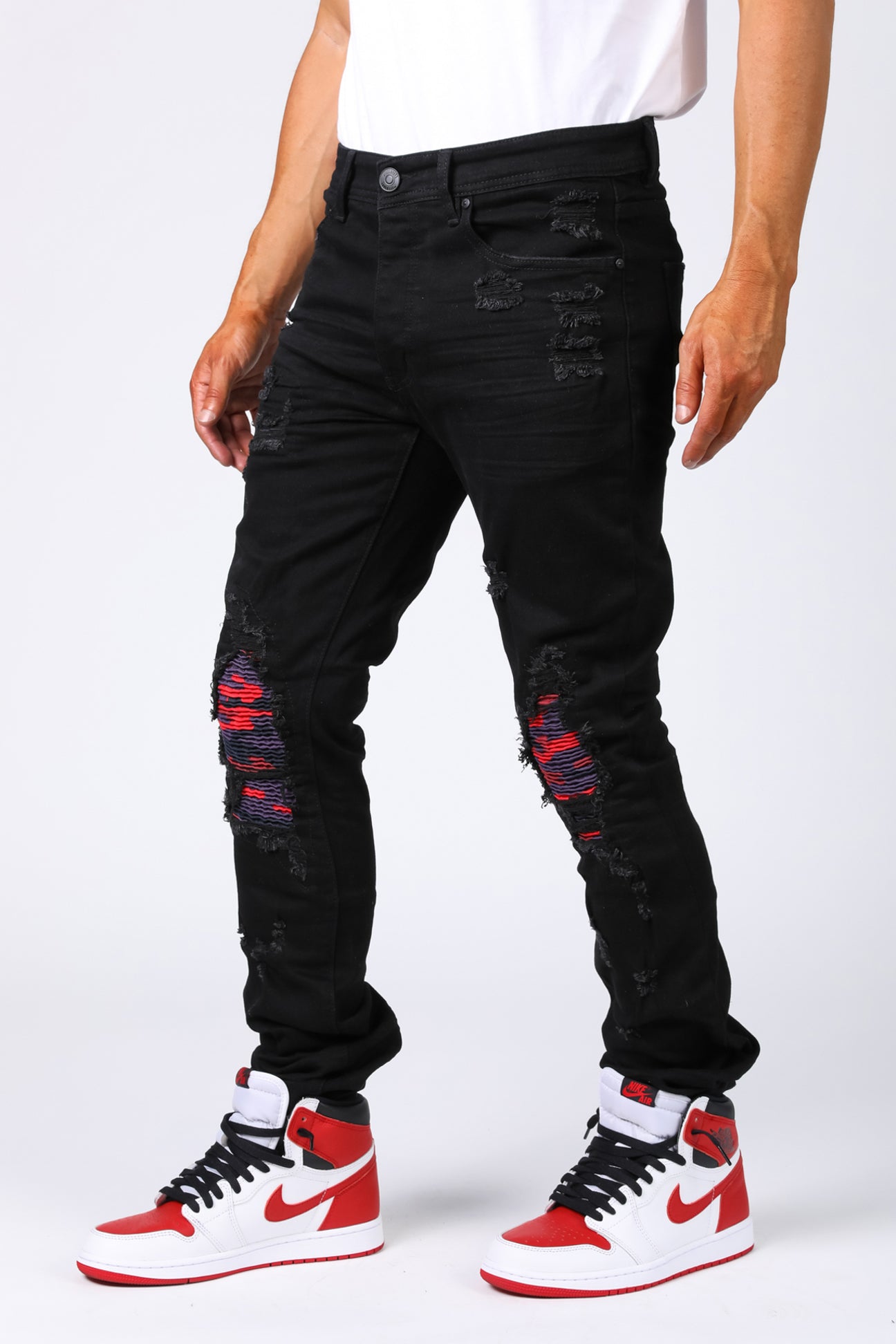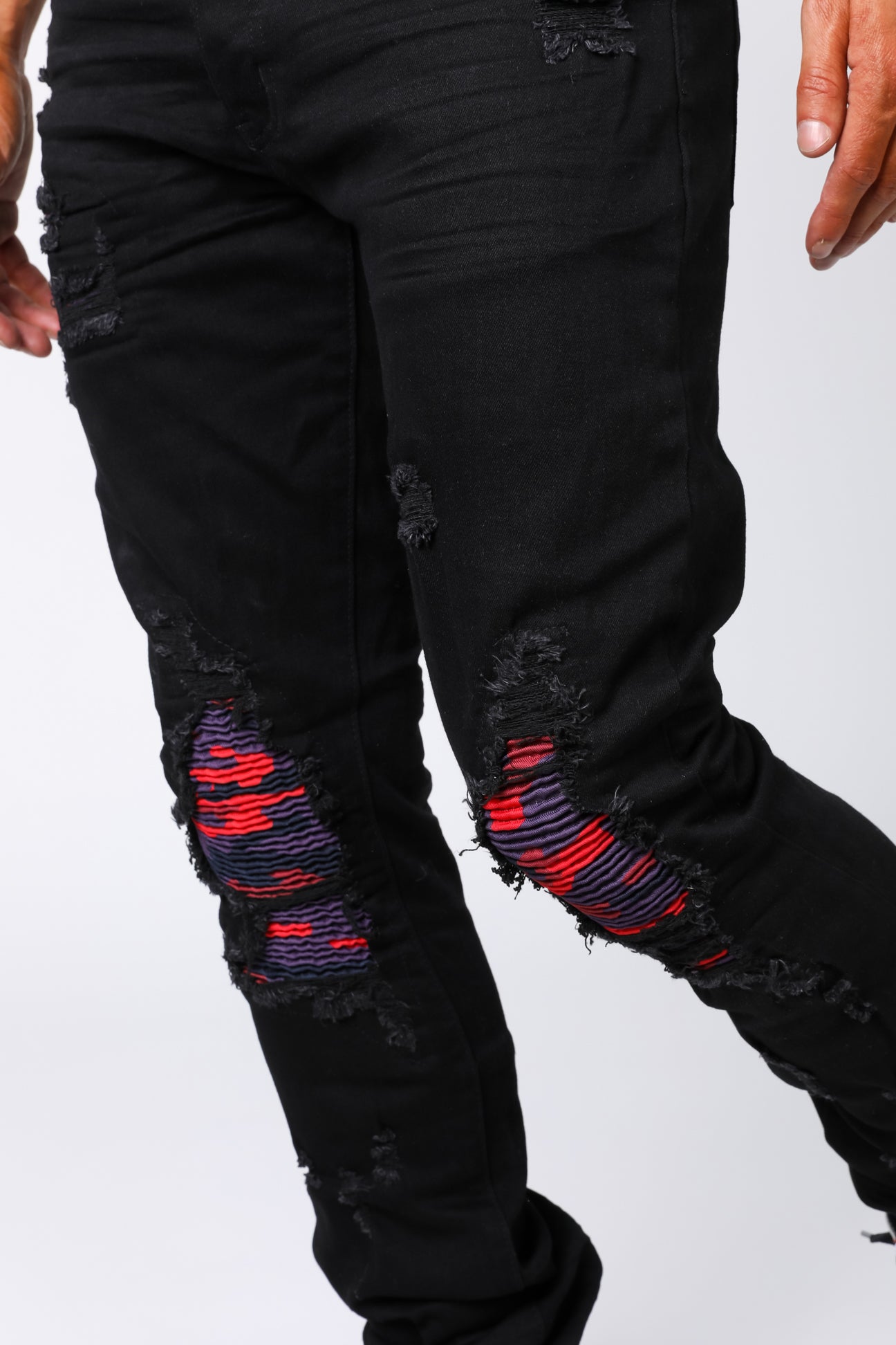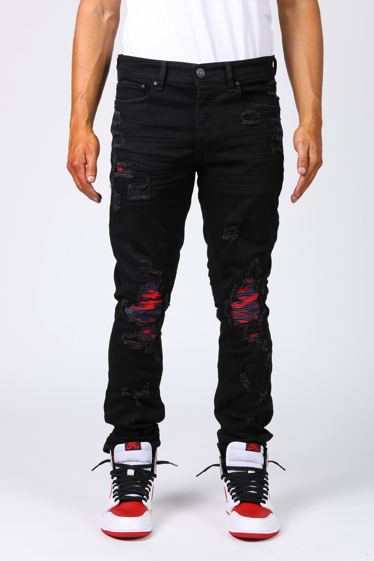 World Tour EZE denim pants. Slim fit denim with color camo accordion baking.