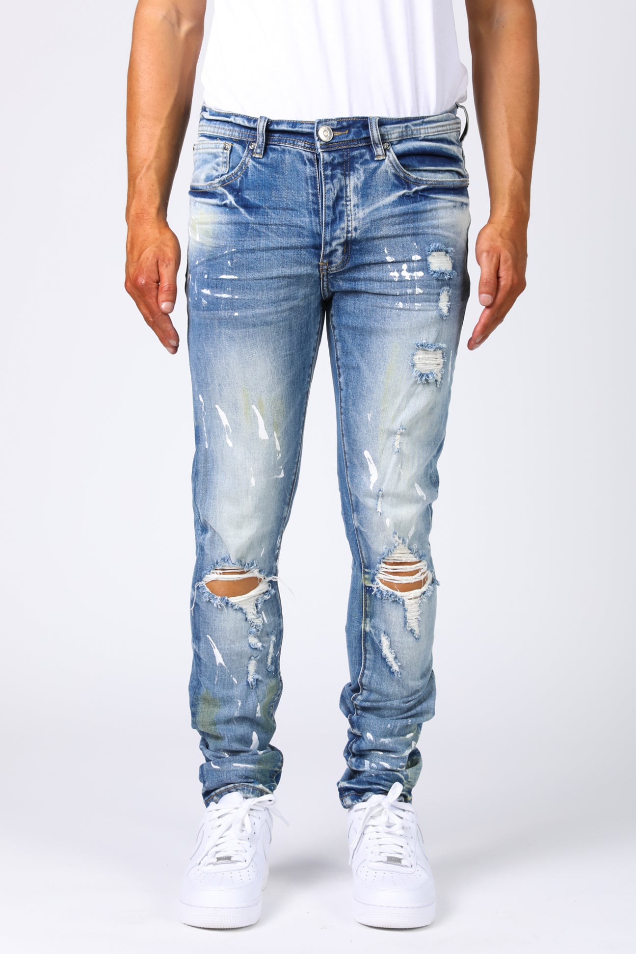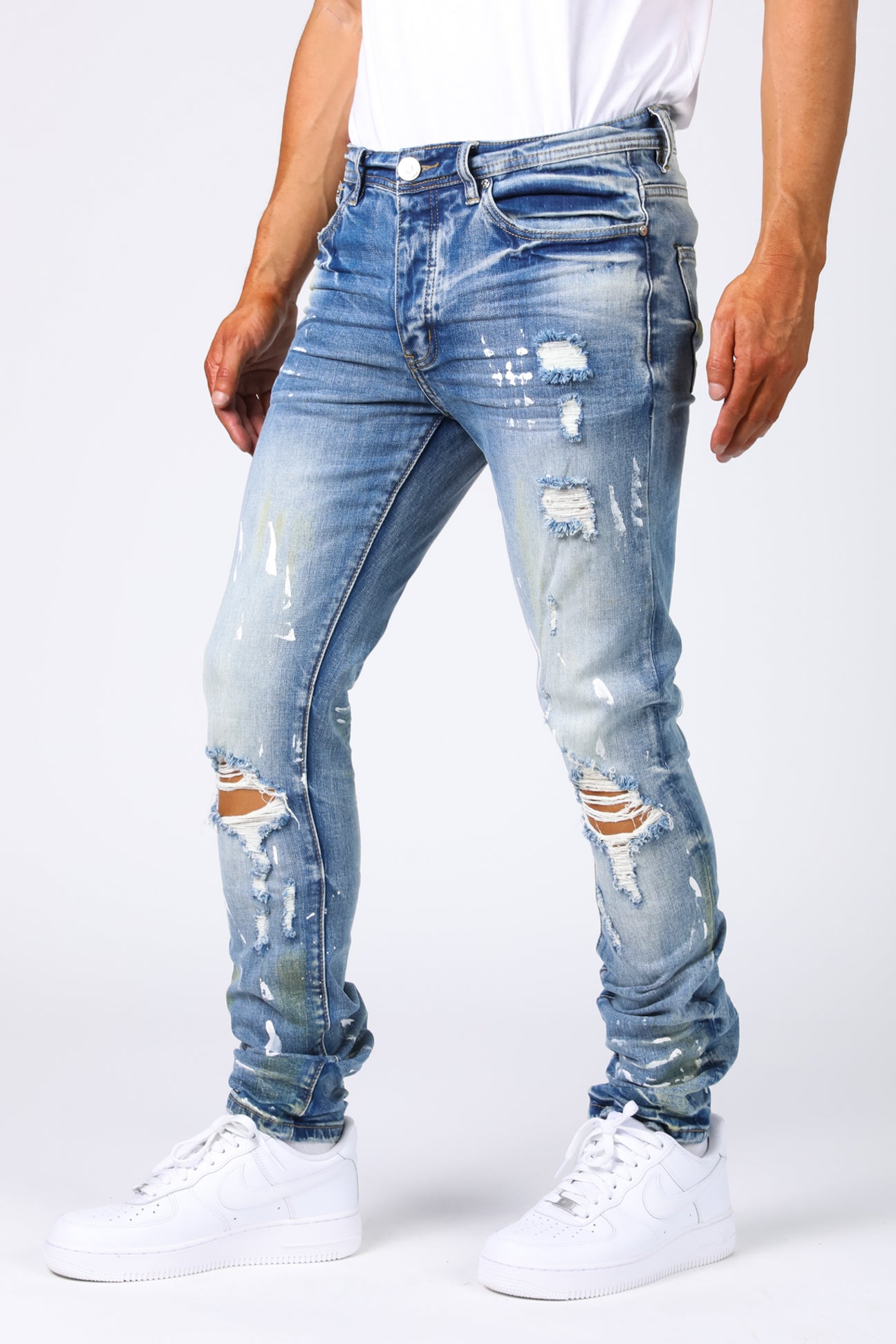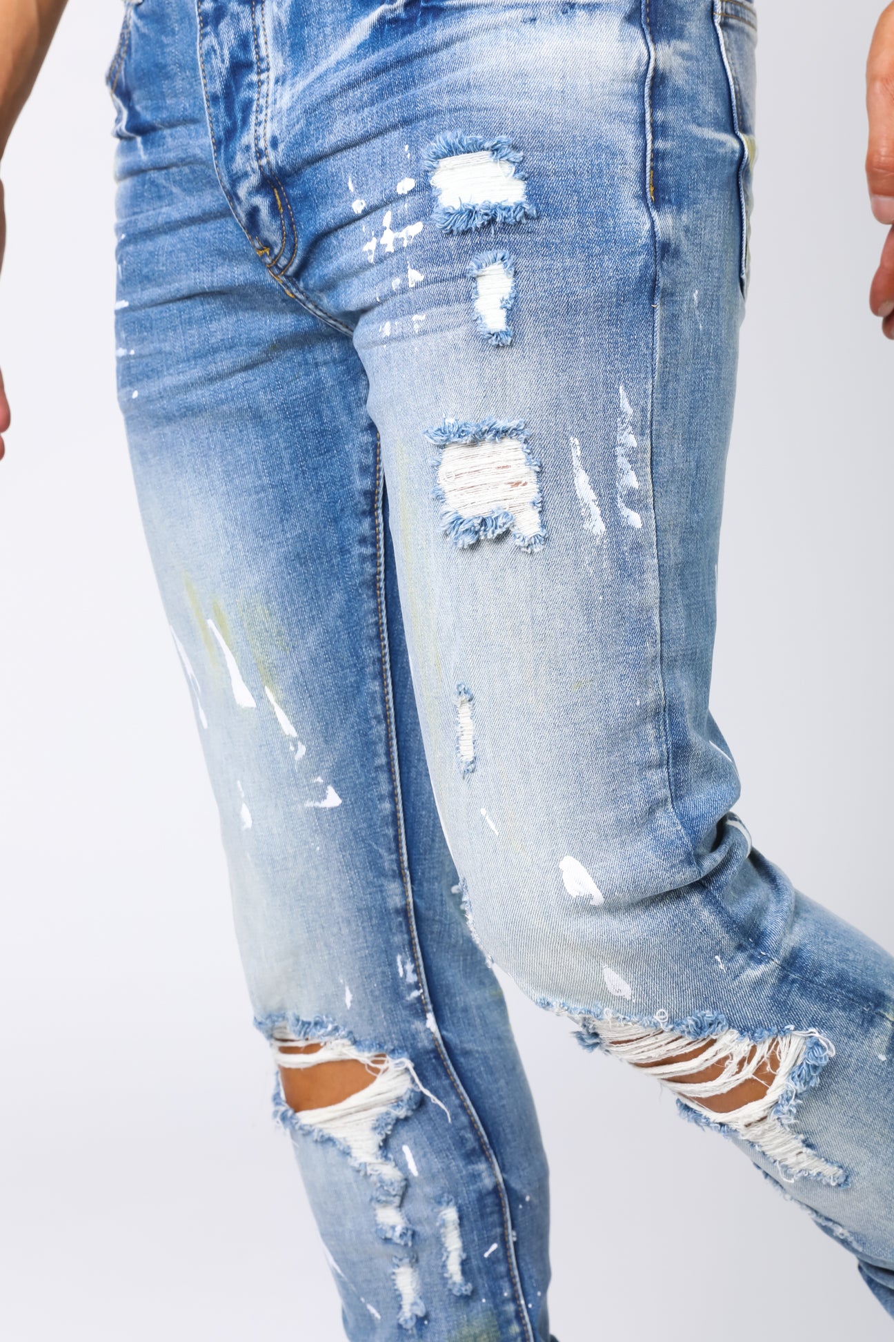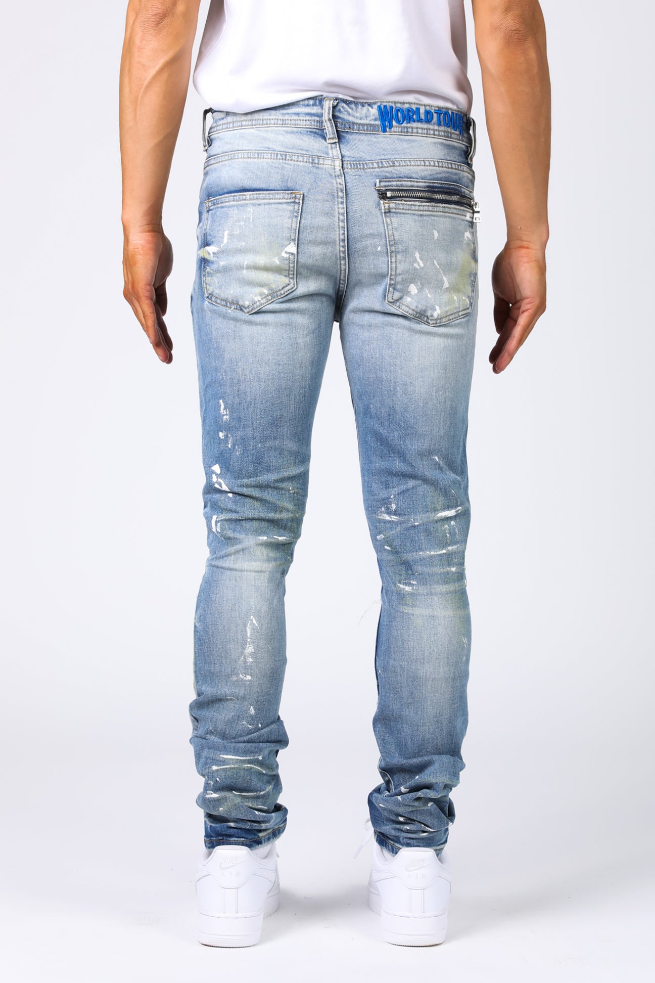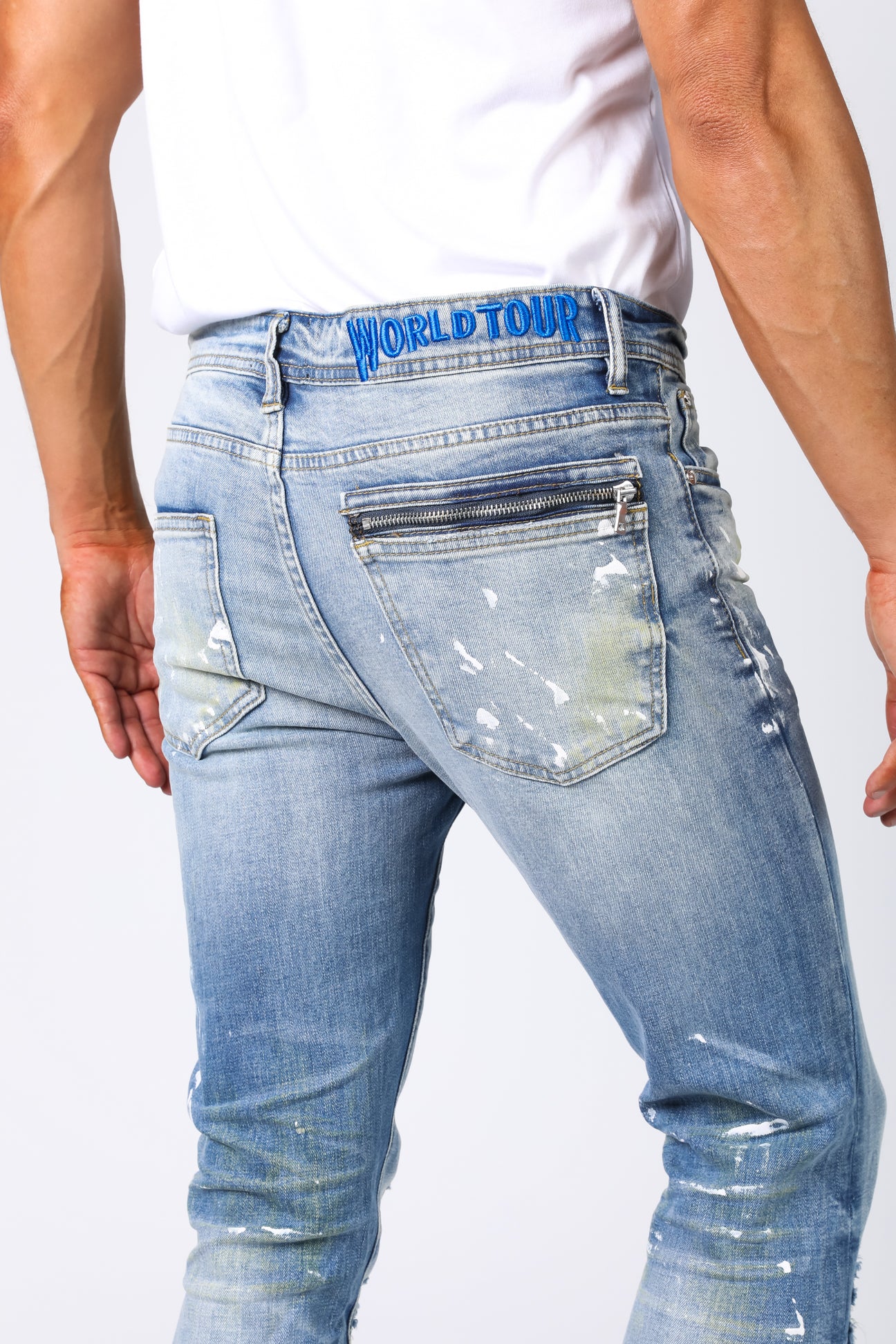 World Tour Jersey denim pant. Slim fit, medium blue with white paint splatters.